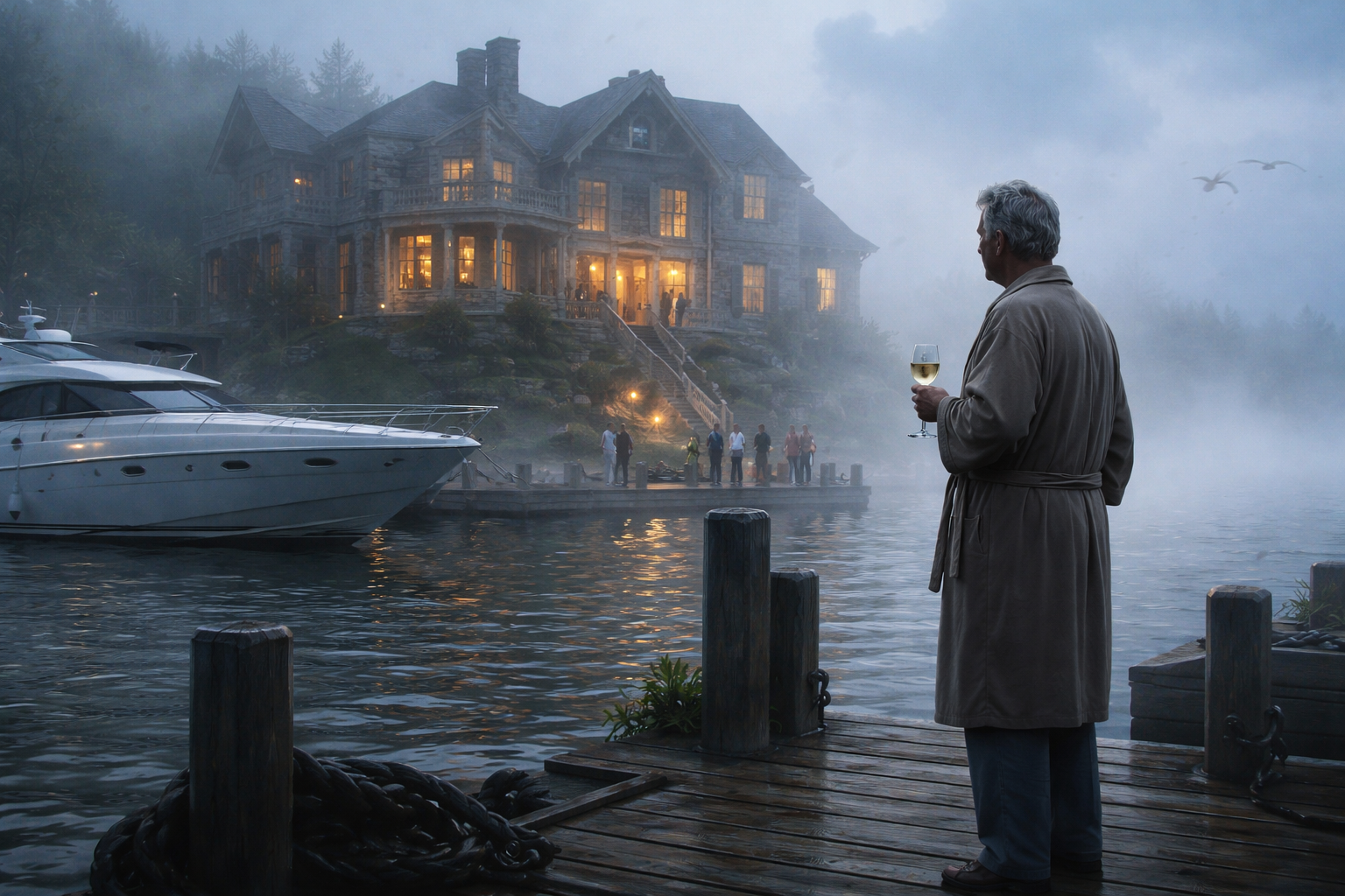 He opened the last bottle of ice wine, poured a little into a crystal flute, and trudged down to the dock. Sitting alone, he stared into the fog and wondered how long he could keep his creditors at bay.